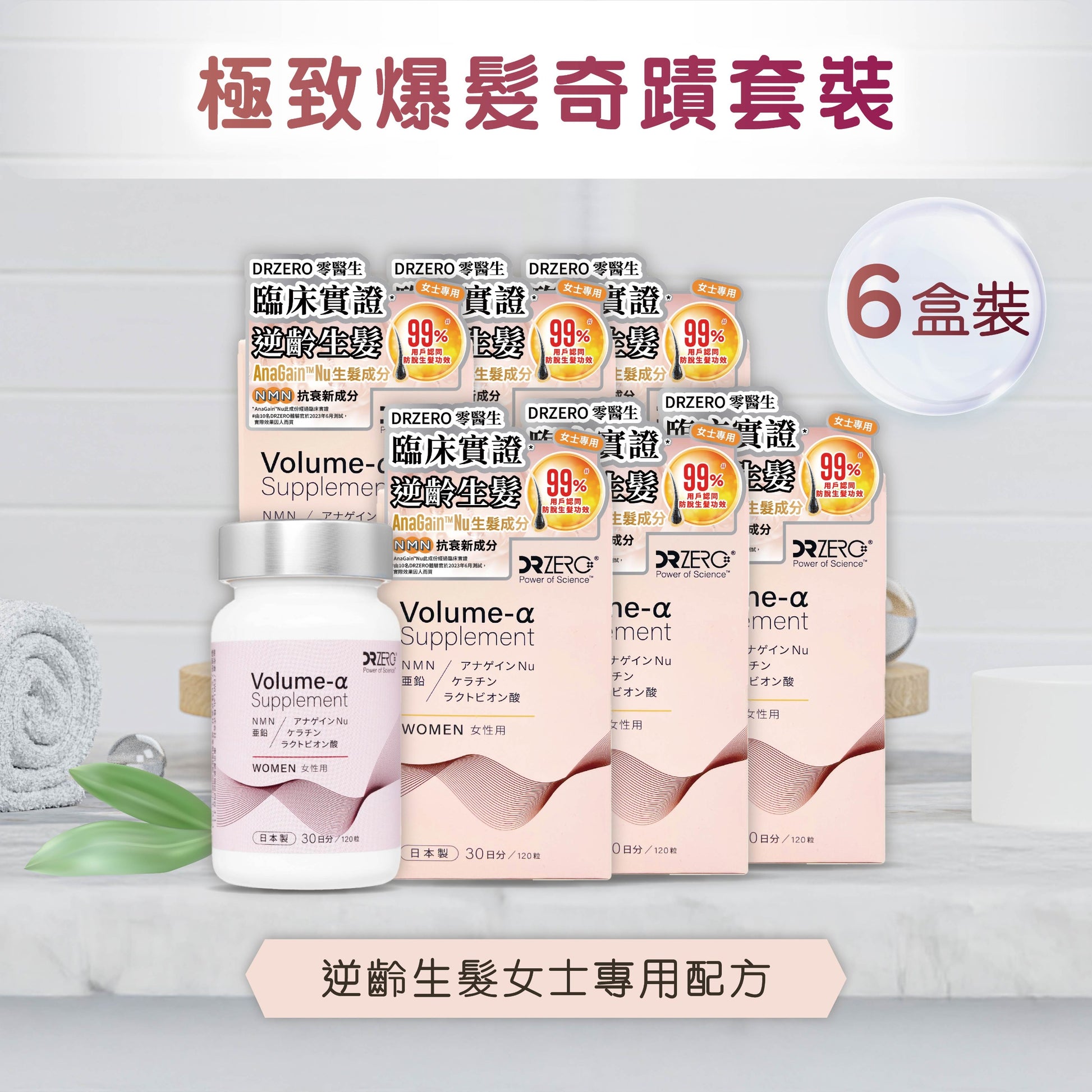 【獨創配方】根據女性頭皮特徵設計,全面解決頭髮問題•臨床驗證生髮成分: AnaGain™ Nu,促進頭髮新生、改善掉髮問題。•抗衰老新成分 NMN: 延緩頭皮老化,幫助維持健康髮根。•女士專屬配方:調節女性荷爾蒙、改善乾燥缺水,增加保濕與防護。•全面頭皮養護:18種氨基酸補充角蛋白養分•獨創配方提升吸收率,搭配DR ZERO根源賦能系列使用,內服外護雙重強化髮根。